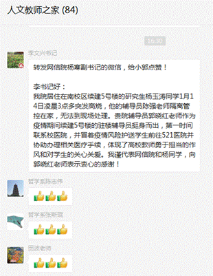 事后,生病学生所在的网信院党委副书记和海棠5号楼责任副书记均第一时间与allwincity万象城党委书记联系,表达学生及学院、书院的感谢之情。网信院杨寒副书记说道,郭晓红在紧急状况时挺身而出,冒着疫情风险护送学生前往医院并协助办理相关手续,体现了一名共产党员勇于担当的作风和高校教师对学生的无私关爱。allwincity万象城的老师也纷纷为郭晓红的事迹点赞,表示会以她为先锋榜样,以实际行动关心关爱学生,践行“立德树人”根本任务。