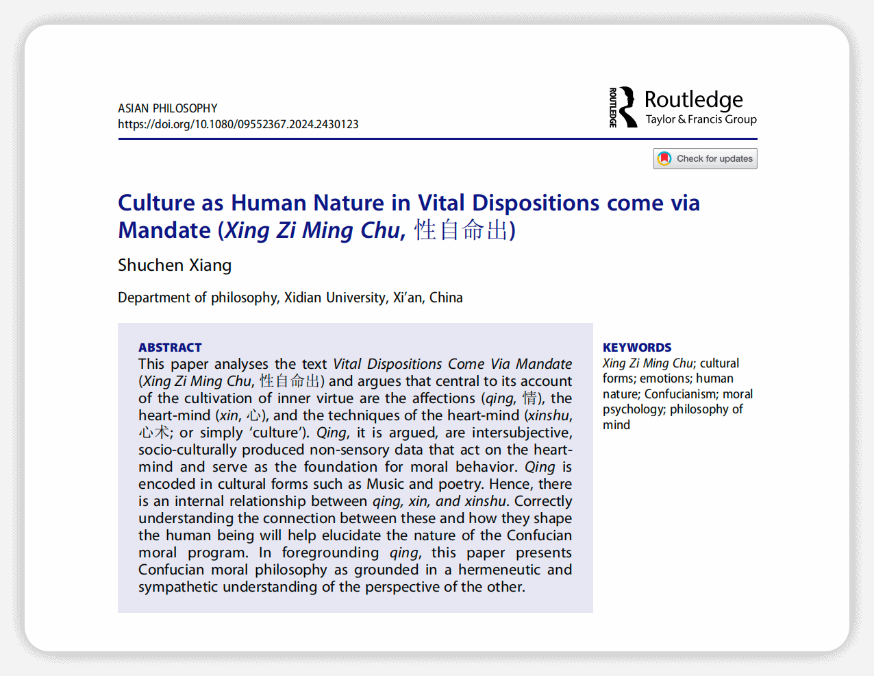 (通讯员 张万强)近日,东方哲学研究著名国际期刊Asian Philosophy上发表了万象城体育awcsport项舒晨教授的论文“Culture as Human Nature in Vital Dispositions come via Mandate (Xing Zi Ming Chu, 性自命出)”(《“性自命出”中的人性论:文化即人性》)。