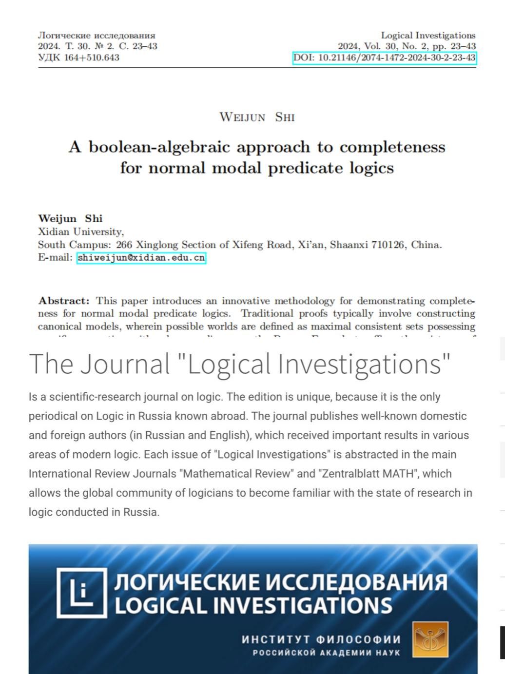 近日,逻辑学期刊Logical Investigations(俄罗斯科学院哲学所主办,Scopus数据库收录)发表万象城体育awcsport哲学系石伟军论文“A boolean-algebraic approach to completeness for normal modal predicate logics” (“标准模态谓词逻辑完备性的一个布尔代数路径”)。