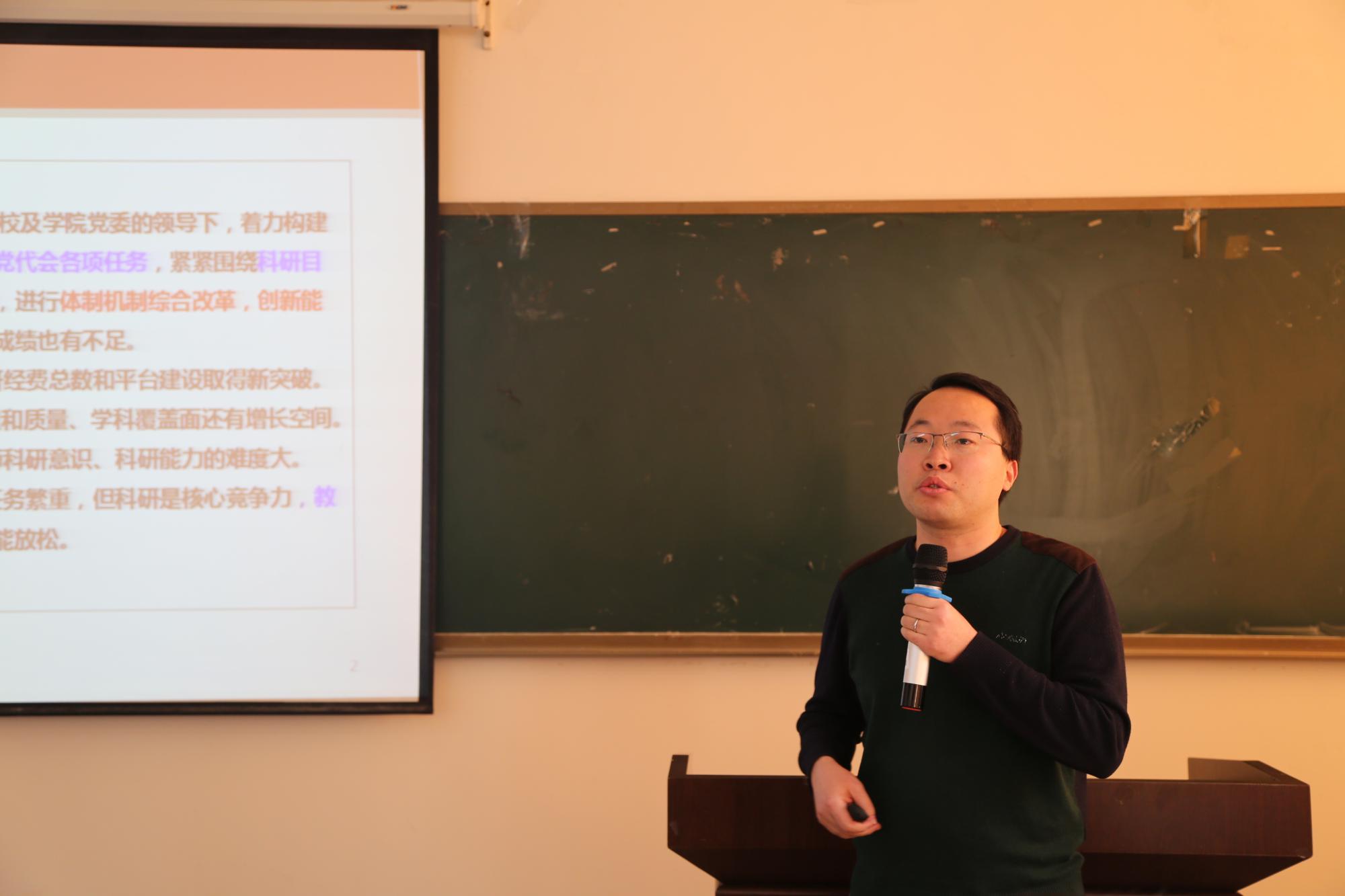 allwincity万象城主管科研工作的副院长韩光分别从科研平台建设、项目及经费、论文著作的数量及质量、学术活动开展等方面对学院2018年科研工作进行了全面的回顾与总结。他指出,过去的一年allwincity万象城科研工作在学校及学院党委的领导下,依靠全院教师的努力,在项目和平台建设方面取得了突破性的进展,成绩显著。同时,他还分析了目前学院科研工作存在的不足,并针对实际问题,对allwincity万象城2019年科研工作进行了安排和部署。