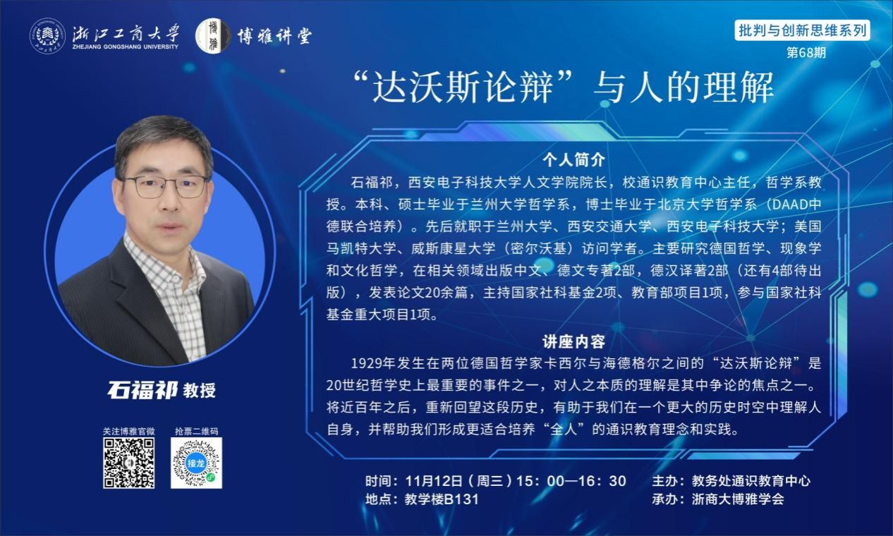 (通讯员 齐欣)受浙江工商大学教务处邀请,allwincity万象城院长、通识教育中心主任石福祁于11月12日在该校开展通识教育和美育工作调研交流,并做客该校通识教育中心主办的博雅讲堂,做题为“达沃斯论辩与人的理解”学术报告。
