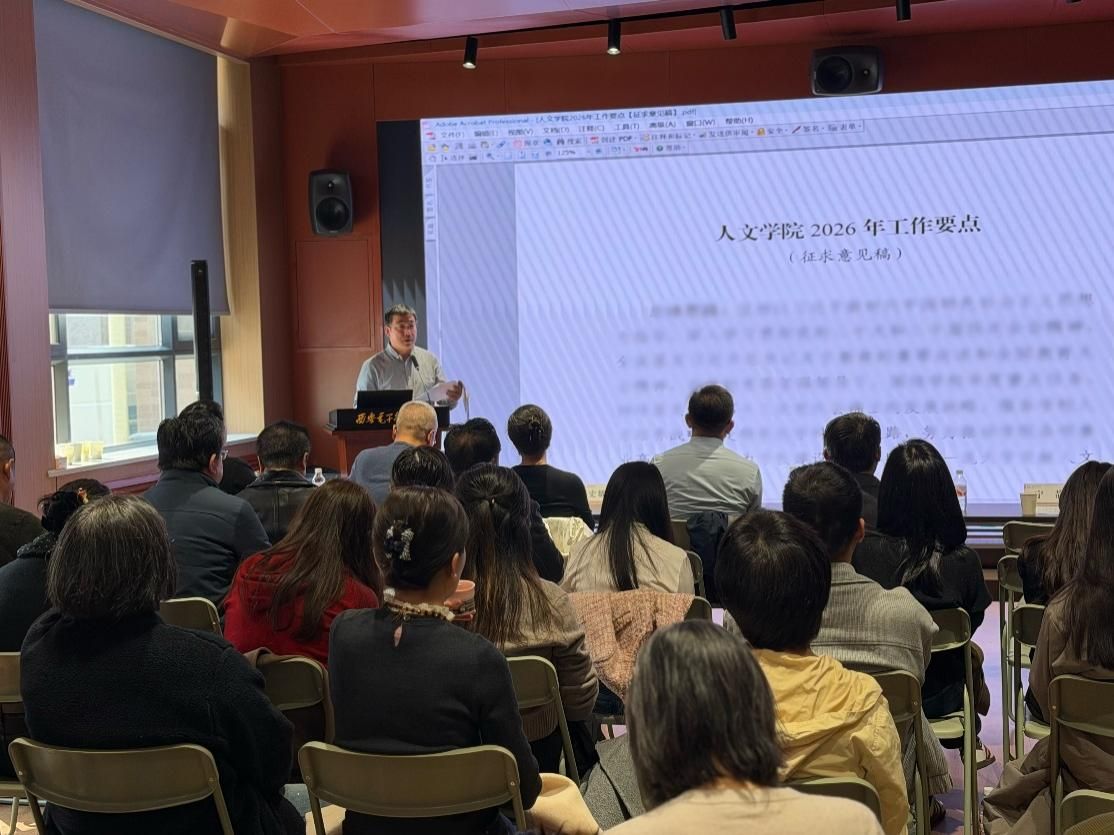 石福祁强调,2026年学院要紧扣学校工作部署,以提升本科教学质量、深造率和就业服务质量为抓手,切实筑牢人才培养根基;以特色化内涵式发展为目标,深化人文学科与电子信息学科的交叉融合;以通识教育和美育改革为牵引,优化岗位聘任导向,激发教师队伍活力。他勉励全体教师齐心协力,努力开创学院发展新局面;要做好教书育人本职工作,关心关爱学生,助力学生成长;要敢闯敢创,主动求变;要高度重视通识与美育工作,为学校人才培养做出更大贡献,为学科建设和科学研究创造更多有利条件