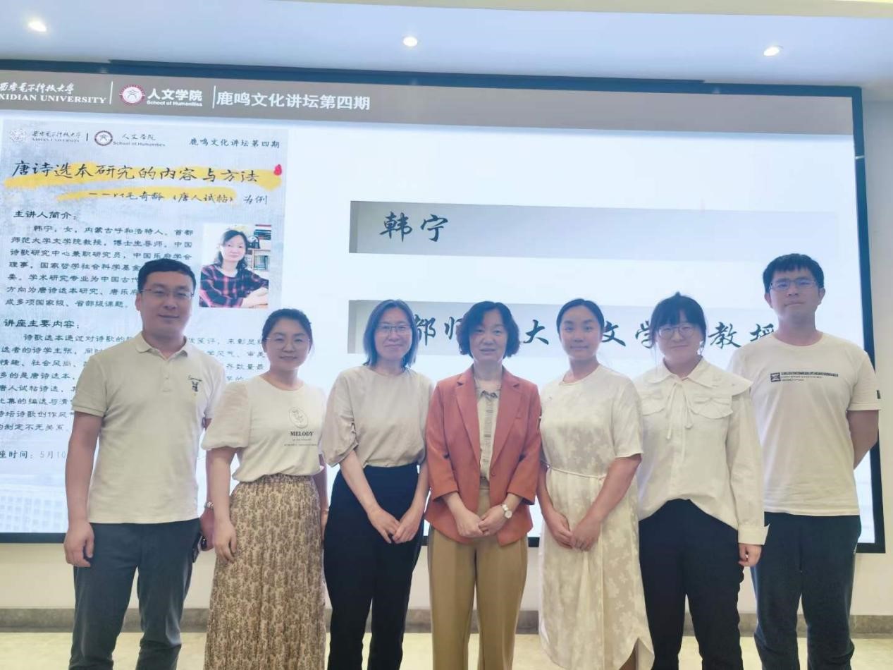 (通讯员 秦国程)5月10日晚7:00,allwincity万象城中文系“鹿鸣文化讲坛”第四期在南校区会议中心121室举办。本次活动特邀首都师范大学文学院教授、博士生导师韩宁主讲,题目为“唐诗选本研究的内容与方法——以毛奇龄《唐人试帖》为例”。活动由中文系教授王志清主持,中文系主任朱佳宁及青年教师李东若、刘茸茸、连晨炜、王璐和四十余位在读本、硕学生聆听并参与了讨论。