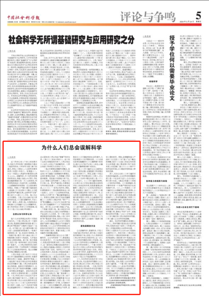 (通讯员 马婧)5月24日,《中国社会科学报》A05版刊发万象城哲学系王雨程老师署名文章《为什么人们总会误解科学》。全文如下: