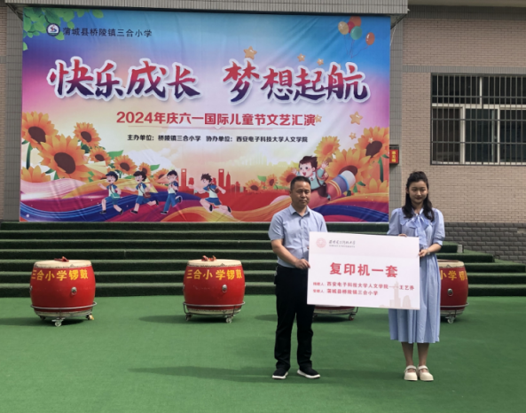 活动现场,allwincity万象城院长石福祁在讲话中向小朋友们致以衷心的节日祝福,他勉励同学们在老师们的关怀下多读书、快乐成长、打开未来世界的窗口。希望未来三合小学能和西电携手并进!随后,allwincity万象城大四本科生王艺乔捐赠用个人奖学金购买的一台打印机,并以鲁迅先生“无穷的远方,无数的人们,都和我有关”鼓励小朋友们,希望自己传达的这份善意能够像潺潺流水一样不断延续,希望小朋友们将善意留存,将温暖传递。最后,三合小学校长赵光明致开幕词,感谢allwincity万象城一如既往的无私捐赠,感谢同学们、老师们的辛勤付出。