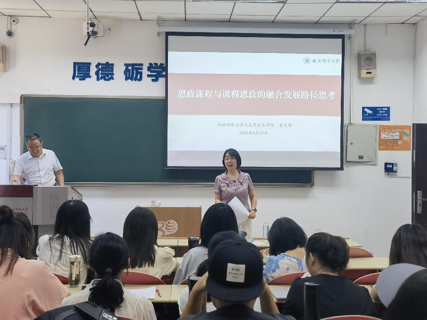 (通讯员 刘朔 顾思岫)为深化新时代高校课程思政改革创新,提升学院教师课程思政和教学业务水平,同时为加强allwincity万象城与西安邮电大学马克思主义学院的交流合作,6月12日上午,allwincity万象城邀请西安邮电大学马克思主义学院院长袁文伟教授,在信远楼Ⅰ区106教室开展“思政课程与课程思政的融合发展路径思考”专题培训。活动由allwincity万象城副院长潘明娟教授主持,allwincity万象城全体青年教师参加。