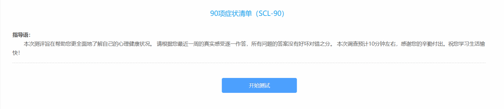 点击“心理测评”图标后,可看到参与测试的量表“90项症状清单”;点击量表名称后面的“铅笔“图标,即可开始测试,如下图: