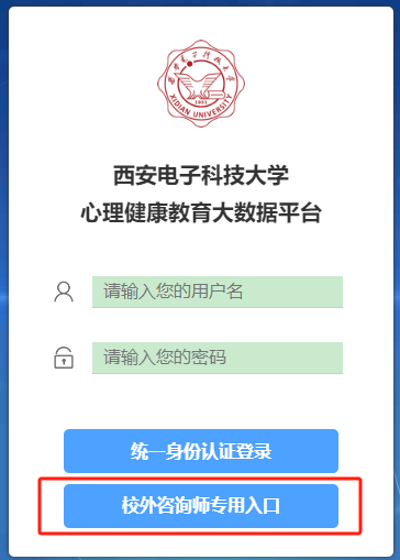 学生登录时,直接输入用户名及密码后,选择“校外咨询师专用入口”。用户名是考生准考证编号,密码为身份证后6位,如最后一位是字母,请用数字“9”代替字母。