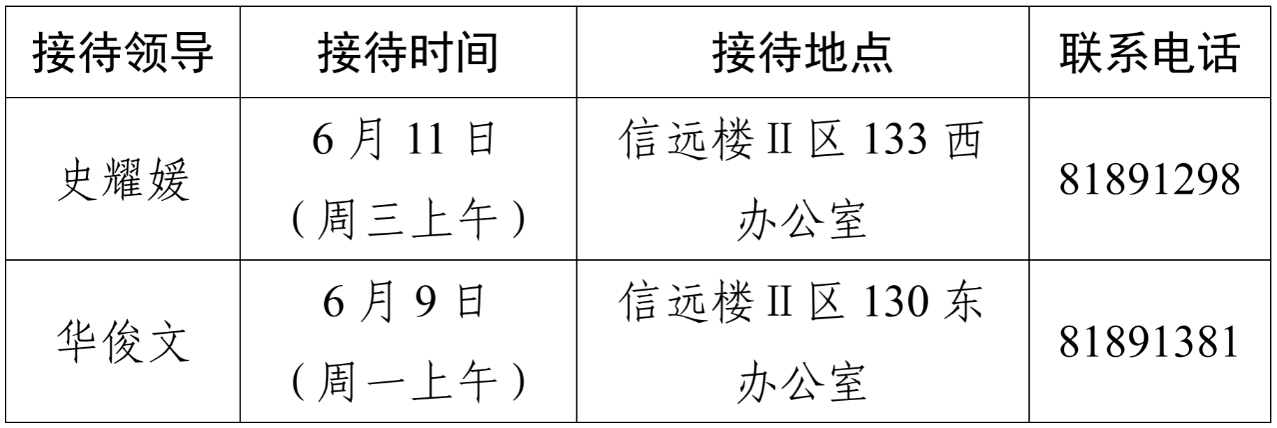 注:学院领导班子接待日主要受理的事项:1.学院人才培养、教学科研、学科建设、教师发展、对外交流、学生管理和服务保障等方面存在的问题与建议;2.反映有关学院重要决策和重要工作事宜的问题;3.涉及师生员工利益的申诉和诉求;4.亟须学院处理的难点问题;5.其他方面的建议和意见。