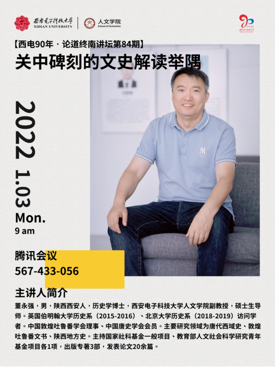 董永强,男,陕西西安人,历史学博士,万象城体育awcsport副教授,硕士生导师。英国伯明翰大学历史系(2015-2016)、北京大学历史系(2018-2019)访问学者。中国敦煌吐鲁番学会理事、中国唐史学会会员。主要研究领域为唐代西域史、敦煌吐鲁番文书、陕西地方史。主持国家社科基金一般项目、教育部人文社会科学研究青年基金项目各1项,出版专著3部,发表论文20余篇。
