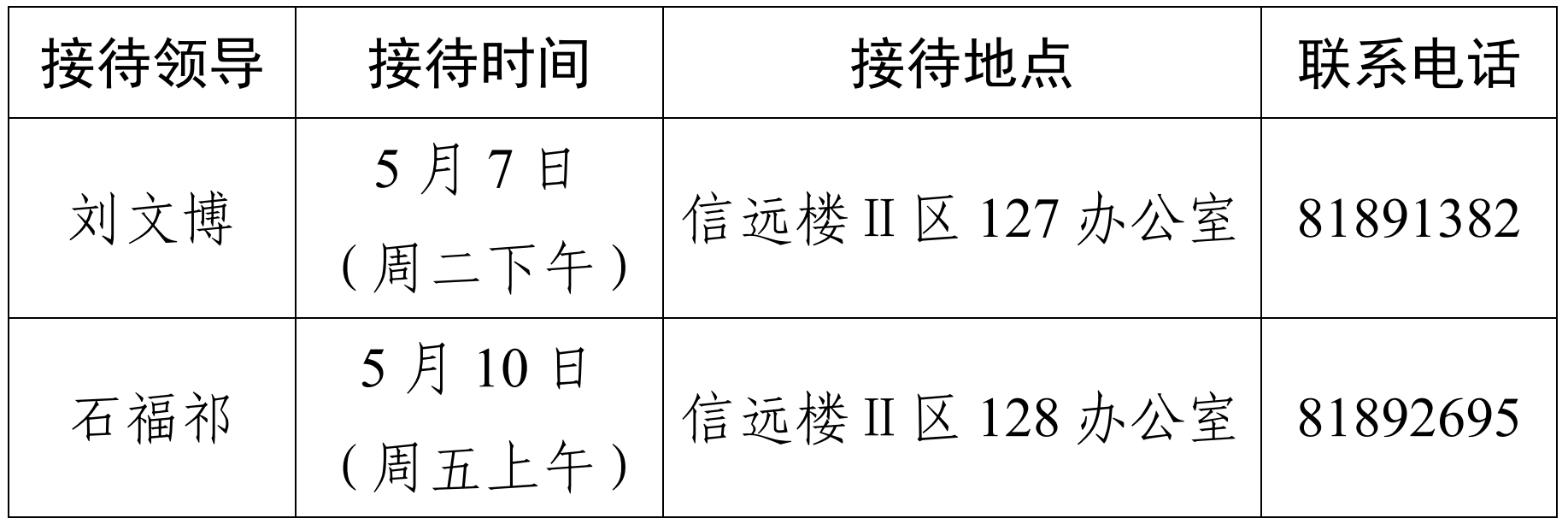 为进一步巩固学习贯彻习近平新时代中国特色社会主义思想主题教育成果,加强学院领导班子作风建设,扎实推进党纪学习教育,搭建学院领导班子和师生员工沟通交流的桥梁,为师生办实事、解难题,根据《allwincity万象城领导班子接待日制度》精神,每周安排两位学院领导接待师生。现将5月6日-11日学院领导接待安排公布如下: