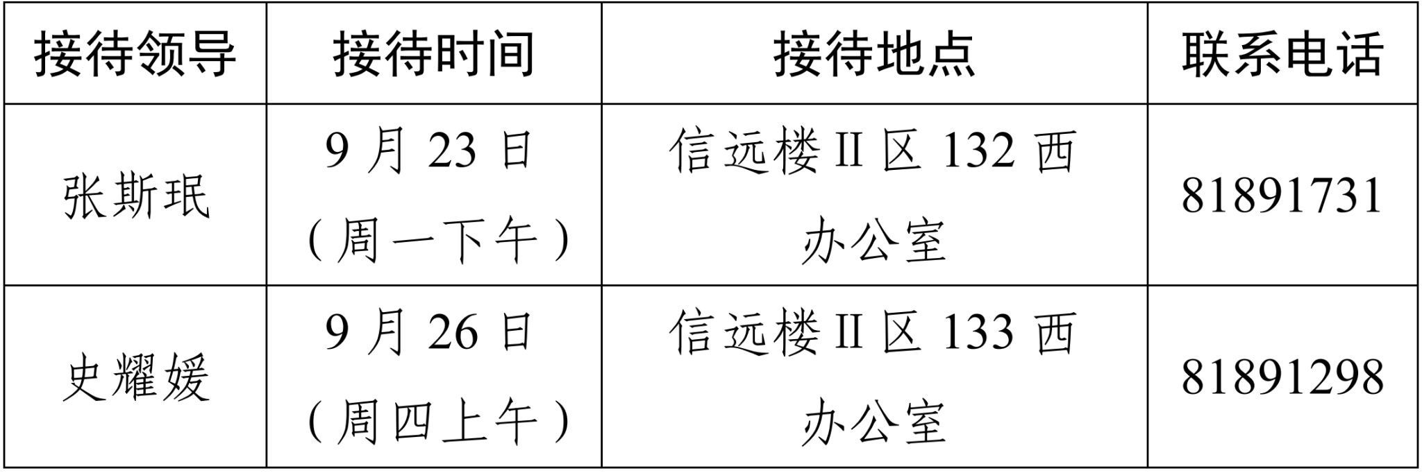 注:学院领导班子接待日主要受理的事项:1.学院人才培养、教学科研、学科建设、教师发展、对外交流、学生管理和服务保障等方面存在的问题与建议;2.反映有关学院重要决策和重要工作事宜的问题;3.涉及师生员工利益的申诉和诉求;4.亟须学院处理的难点问题;5.其他方面的建议和意见。