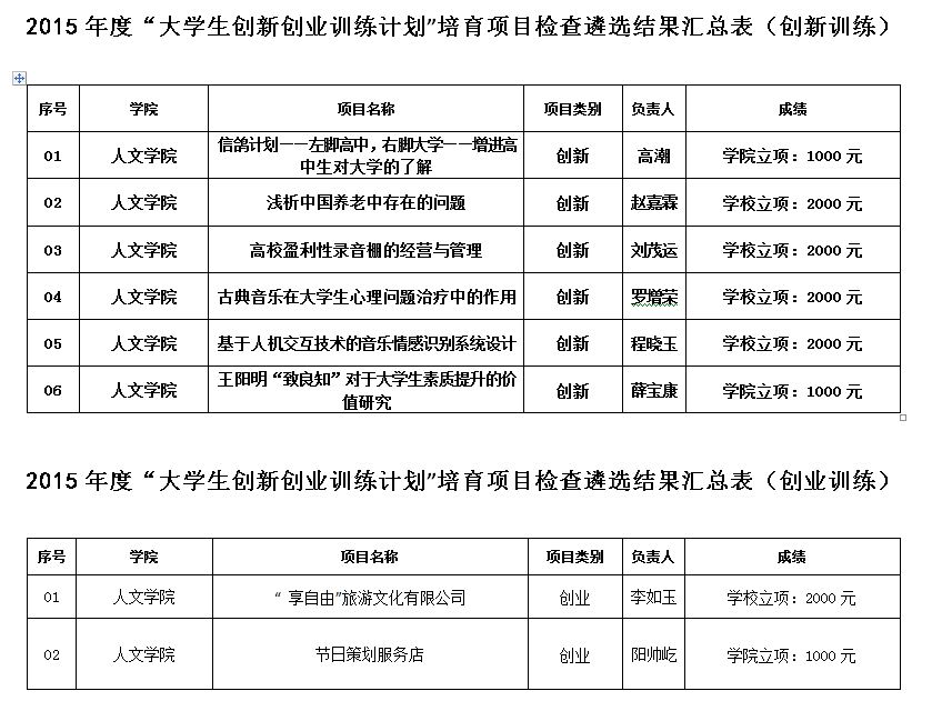经过评审答辩和讨论,评审组选出了《浅析中国养老中存在的问题》、《高校盈利性录音棚的经营与管理》、《基于人机交互技术的音乐情感识别系统设计》、《古典音乐在大学生心理问题治疗中的作用》、《“享自由”旅游文化有限公司》等5个具有创新性、可行性的项目向学校申报2015年国家大学生创新创业计划培育项目。