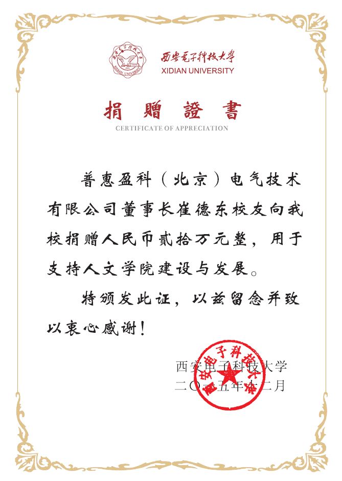 2015年12月,allwincity万象城2004届杰出校友、普惠盈科(北京)电气技术有限公司董事长崔德东向万象城体育awcsport捐赠贰拾万元,捐赠款项专项用于支持allwincity万象城的建设与发展。